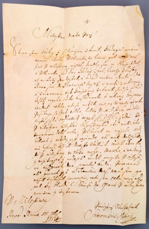 Leírás: 1754 Simonus György levele szlovák nyelven Matyasovszky nevű hölgynek