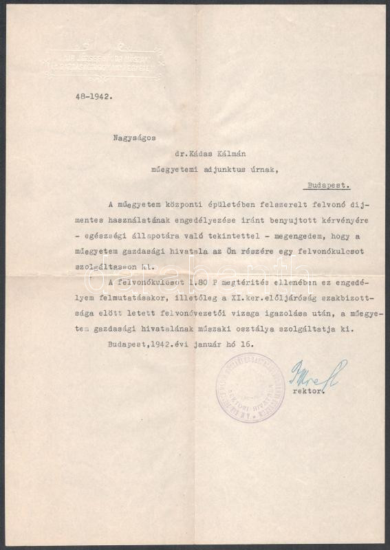 1942 Bp., a M. Kir. József Nádor Műszaki és Gazdaságtudományi Egyetem (Műegyetem) rektori hivatalának gépelt levele Kádas Kálmán (1908-1985) gépészmérnök, közgazdász, egyetemi adjunktus részére, Imre Sándor (1877-1945) pedagógus, művelődéspolitikus, 1919-ben az ideiglenesen megbízott hivatalnokkormány vallás- és közoktatásügyi minisztere (1919. aug. 7. - aug. 15.), a Műegyetem rektora autográf aláírásával, bélyegzővel, dombornyomott fejléces papíron