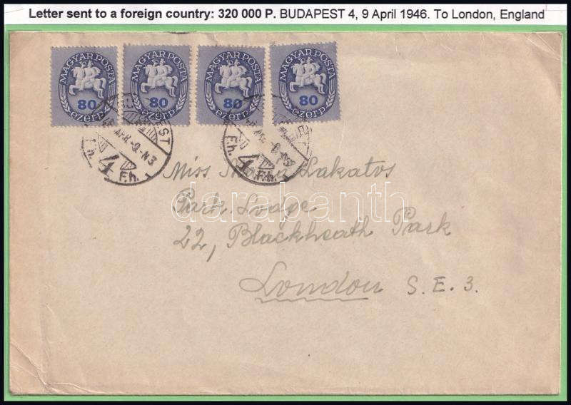 1946 (11. díjszabás) Levél 320.000P bérmentesítéssel Londonba (4 x Lov... https://www.darabanth.com/hu/496-Gyorsarveres/496.0/Magyar-filatelia-es-postatortenet/A-II-inflacio-idoszaka-1945-1946~1000053/1946-11-dijszabas-Level-320000P-bermentesitessel-Londonba-4-x-Lovasfutar-80-ezer-P~II2898225