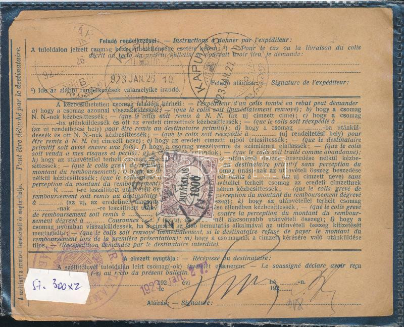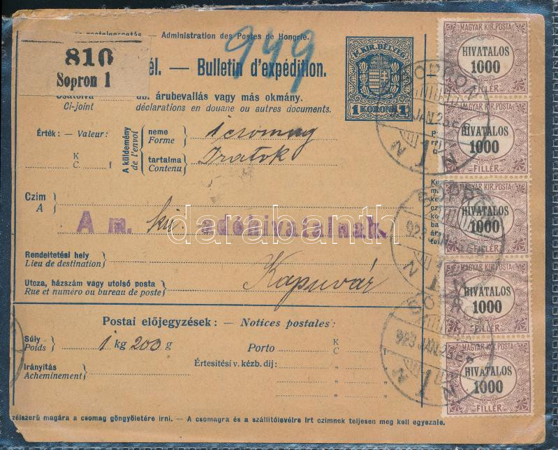 1923 Csomagszállító 6 db Hivatalos 1000f bélyeggel, közte hármaslyukas... https://www.darabanth.com/hu/496-Gyorsarveres/496.0/Magyar-filatelia-es-postatortenet/A-Korona-inflacio-idoszaka~1000048/1923-Csomagszallito-6-db-Hivatalos-1000f-belyeggel-kozte-harmaslyukasztas~II2832251