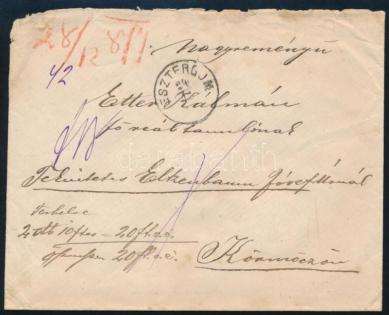 Leírás: 1877 Pénzes levél Esztergomból Körmöczre