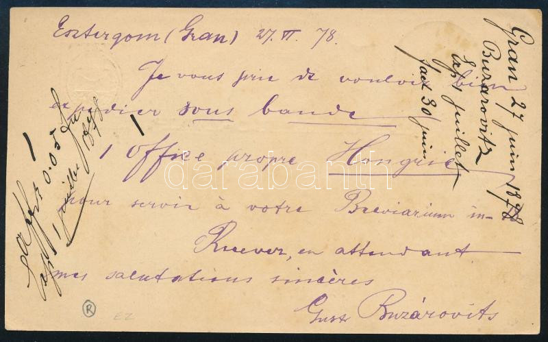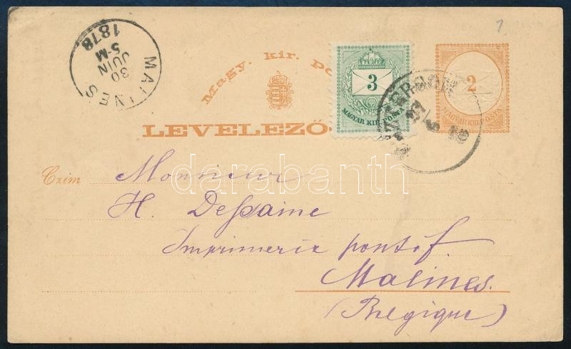 1878 Díjkiegészített díjjegyes levelezőlap Esztergomból Belgiumba https://www.darabanth.com/hu/496-Gyorsarveres/496.0/Magyar-filatelia-es-postatortenet/Az-1874-1899-kozotti-krajcaros-kiadasok~1000033/1878-Dijkiegeszitett-dijjegyes-levelezolap-Esztergombol-Belgiumba~II3265783