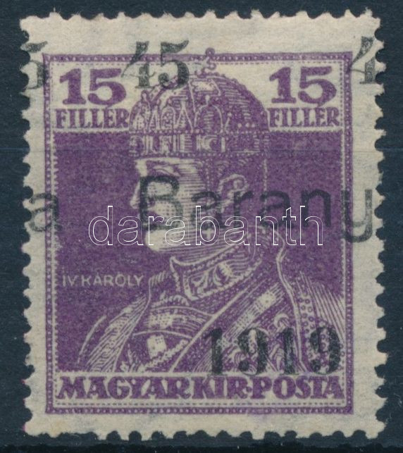 Leírás: Baranya I. 1919 Károly 45/15f próbanyomat , Bodor vizsgálójellel