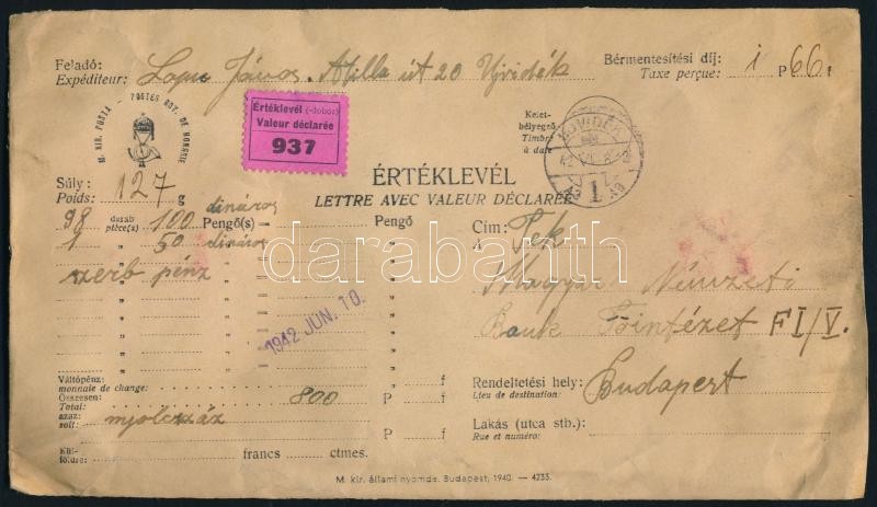 1942 Értéklevél 9.800 Pengőről, 1,66P bérmentesítéssel / Insured cover... https://www.darabanth.com/hu/496-Gyorsarveres/496.0/Magyar-filatelia-es-postatortenet/Pengo-idoszak-1926-1944~1000049/1942-Erteklevel-9800-Pengorol-1-66P-bermentesitessel-Insured-cover-UJVIDEK~II1586066