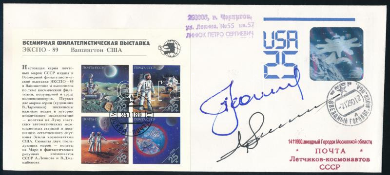 Leírás: Alekszej Leonov (1934- ) és Vlagyimir Dzsanyibekov (1942- ) orosz űrhajósok aláírásai emlékborítékon /