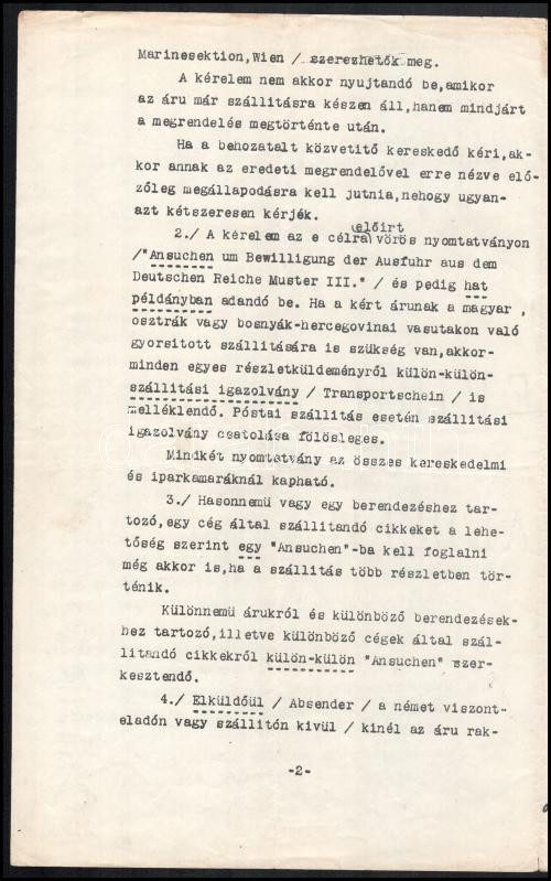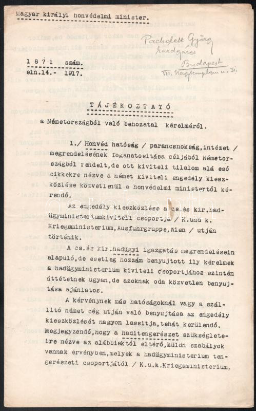 1916 A Cs. és Kir. Hadügyminisztérium kiviteli csoportja (K. u. k. Kriegsministerium Ausfuhrgruppe) német nyelvű levele Pacholek György kardgyáros részére, a németországi Weyersberg & Co. (Solingen) cég által gyártott kardpengék behozatalával kapcsolatosan + 1917 A m. kir. honvédelmi miniszter tájékoztatója a Németországból való behozatal kérelméről, 7 oldalon