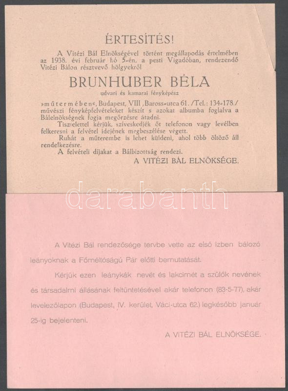 Leírás: 1938 A Vitézi Bál Elnöksége által kiadott 2 db értesítés
