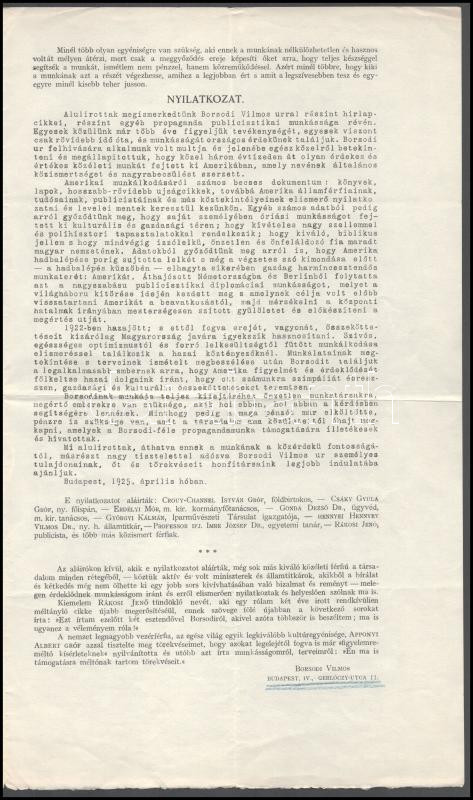Leírás: 1925 Borsodi Miklós újságíró tájékoztatója, bizalmas