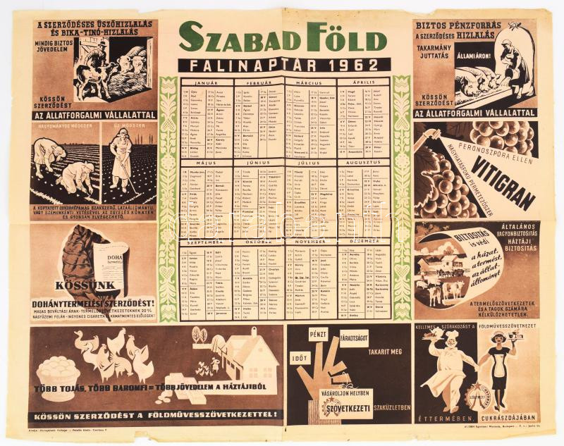 Leírás: 1962 Szabad Föld falinaptár, Bp., Egyetemi Ny., hajtva, kisebb lapszéli sérülésekkel, 47x60 cm