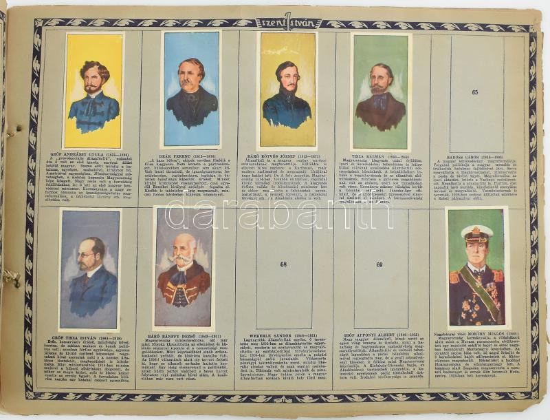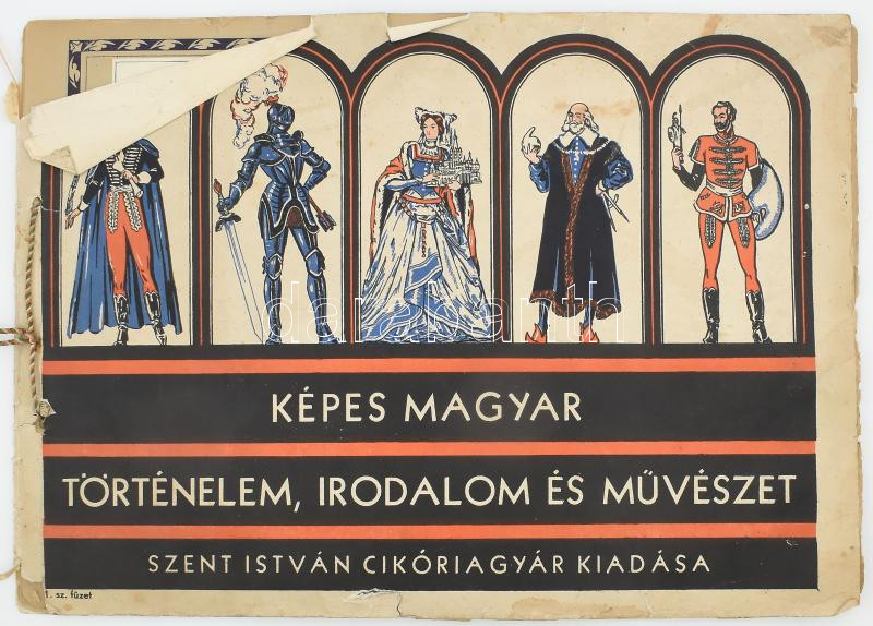 cca 1930-1940 Képes magyar történelem, irodalom és művészet, a Szent István Cikóriagyár gyűjtőalbuma (1. sz. füzet), jórészt hiányos tartalommal, nemzeti színű zsinórral, sérült borító