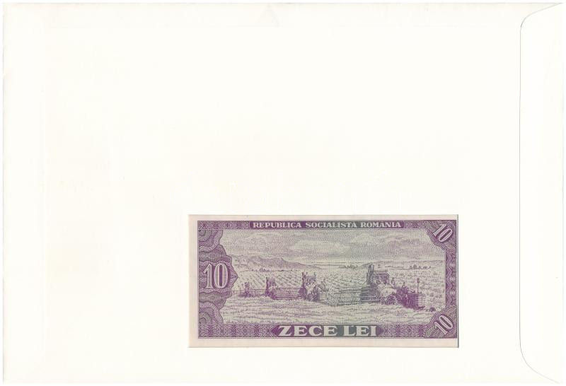 Romania 1966. 10 Lei in envelope with stamp and cancellation C:UNC