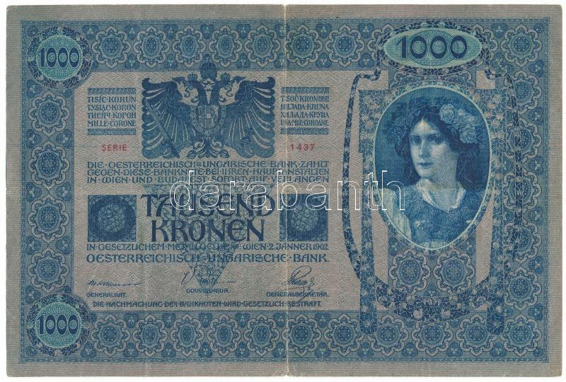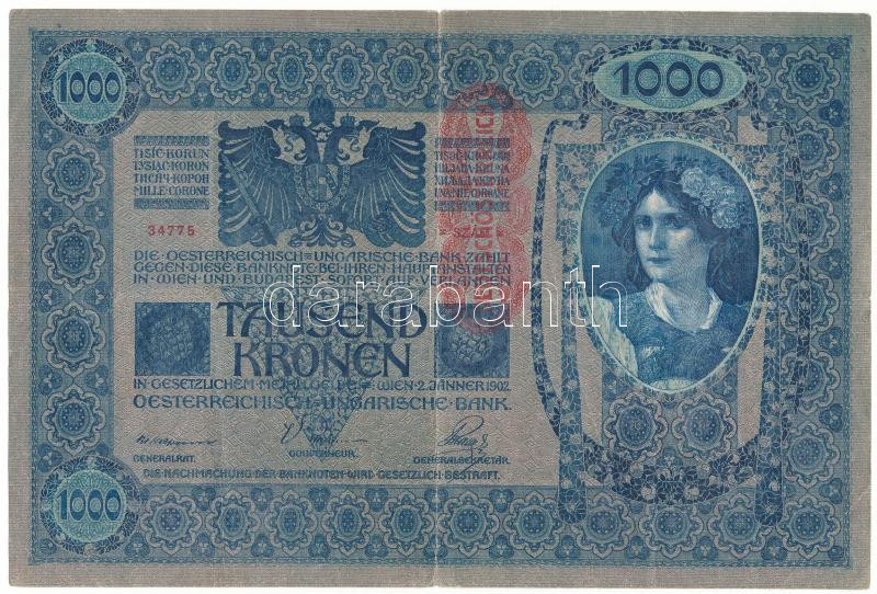 Ausztria 1919. (1902) 1000K, függőleges "DEUTSCHÖSTERREICH" felülbélyegzéssel, "1437 34775" mindkét oldal német T:F, pici szakadások