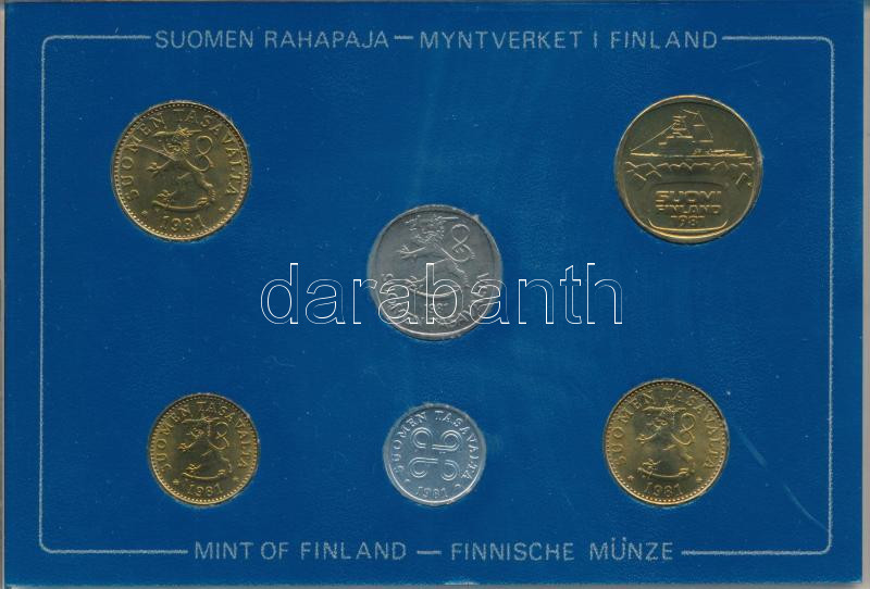 Fin... https://www.darabanth.com/hu/496-Gyorsarveres/496.0/Numizmatika/Kulfoldi-forgalmi-sorok~1500022/Finnorszag-1981-5p-5M-6xklf-forgalmi-sor-muanyag-tokban-TAU3Cbr-3E-Finland-1981-5-Pennia-~II3393724