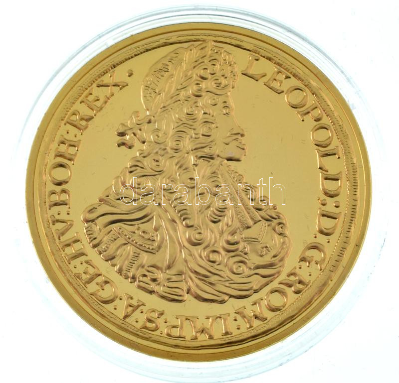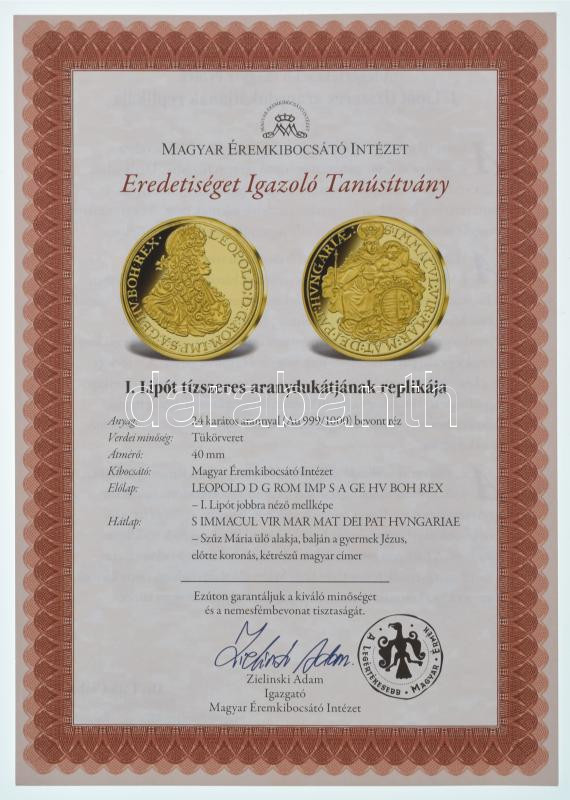 Leírás: DN "A legértékesebb magyar érmék - I. Lipót tízszeres aranydukátjának replikája" aranyozott Cu emlékérem, "COPY" jelzéssel, tanúsítvánnyal (40mm) T:PP