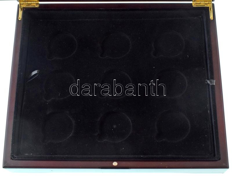 Mahagóni fa érmetartó kazetta bársonybéléssel, 1db kivehető tálcával, összesen 15db ~45mm-es férőhellyel, használt de jó állapotban, sérült sarokkal (~305x265x60mm)