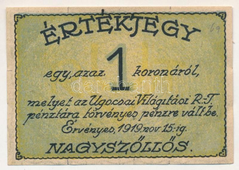 Nagyszőllős 1919. 1K "Ugocsai Világítási Rt." értékjegy T:F ... https://www.darabanth.com/hu/496-Gyorsarveres/496.0/Numizmatika/Papir-es-fem-szuksegpenzek~1500007/Nagyszollos-1919-1K-Ugocsai-Vilagitasi-Rt-ertekjegy-TF-szep-papir3Cbr-3E-Hungary-Nag~II3386739