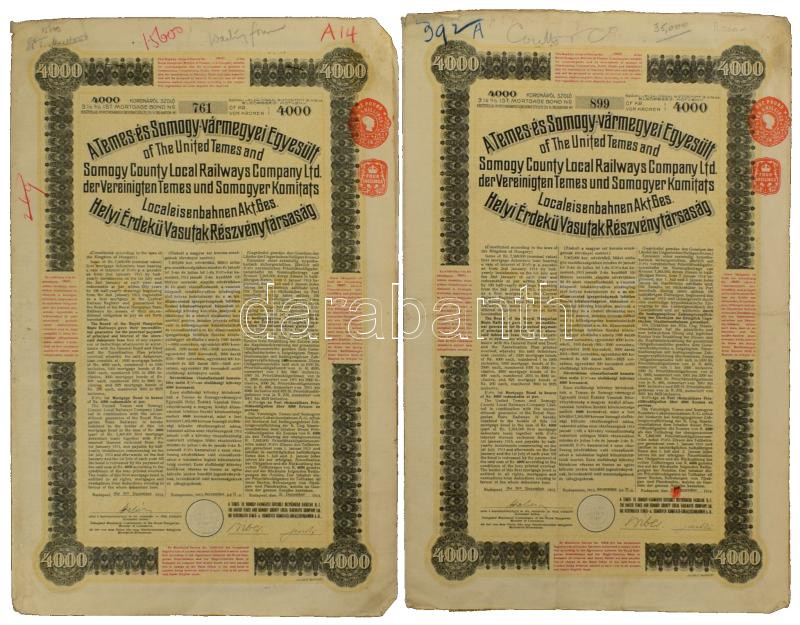 1913. Budapest "A Temes- és Somogy-vármegyei Egyesült Helyi Érdekű Vasutak Részvénytársaság" 3 1/2%-os elsőbbségi kötvénye 4000K-ról (2x) , magyar, német és angol nyelven, szárazpecséttel és szelvényekkel T:F