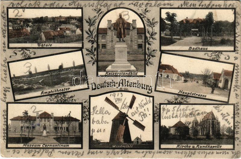 Bad Deutsch-Altenburg, Totale, Amphitheater, Kaiserstandbild, Badhaus, Hauptstrasse, Museum Carnuntinum, Windmühle, Kirche u. Rundkapelle / general view, amphitheatre, Franz Joseph I of Austria monument, spa, main street, museum, windmill, church and chapel. Art Nouveau, floral (EK)