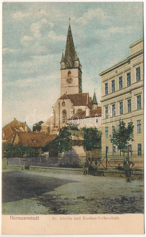 1911 Nagyszeben, Hermannstadt, Sibiu; Ev. Kirche und Knaben-Volksschule. Verlag G. A. Seraphin / Evangélikus templom és fiú iskola / street, Lutheran boy school and church (EK)