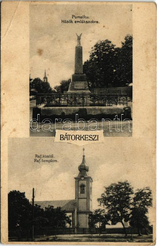 Bátorkeszi, Bátorove Kosihy, Bátorove Kesy, Vojnice; Hősök emlékszobor, Református templom. Hollender a Végh kiadása / Pomatku, kostol / military heroes monument, Calvinist church (fl)