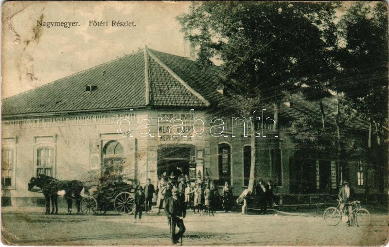 Nagymegyer, Velky Meder, Calovo; Fő tér, Weisz Albert üzlete, férfi kerékpárral. Haladás Könyvnyomda kiadása / main square, shop of Weisz, man with bicycle (b)