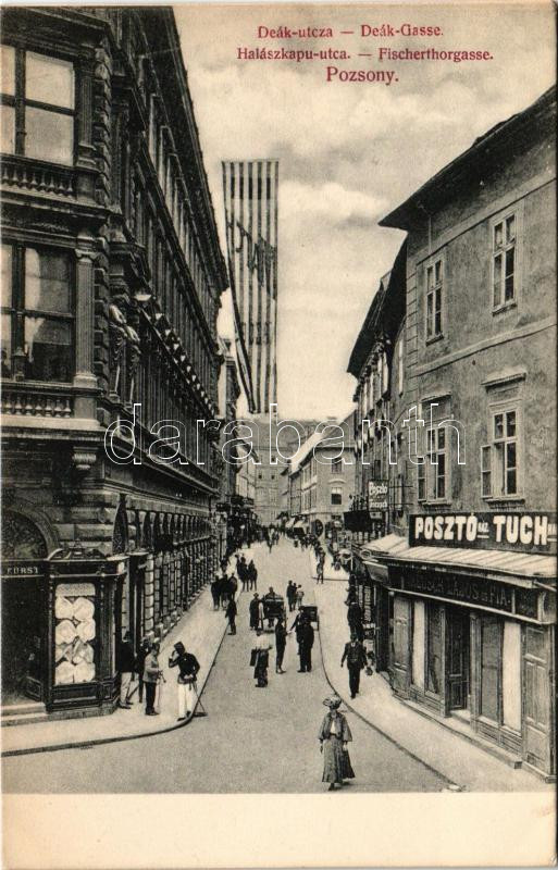 Pozsony, Pressburg, Bratislava; Halászkapu utca, Deák utca, Posztóház, Treusch Lajos és fia, Fürst üzlete. Divald Károly 1037. sz. / street, shops, cloth house