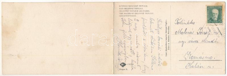 Leírás: Szklenófürdő, Sklené Teplice; Úri fürdő. 2-részes kihajtható panorámalap / spa, bath. 2-tiled folding panoramacard (kis szakadás / small tear)