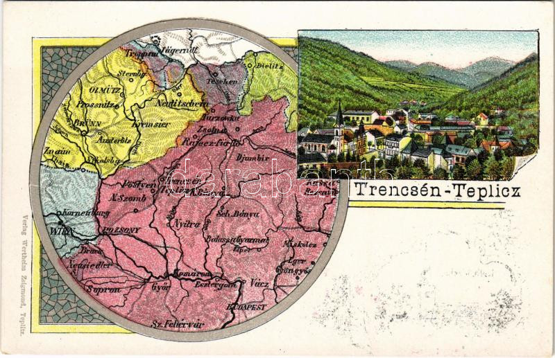Leírás: Trencsénteplic, Trencianske Teplice; Gyógyterem, fürdő, térkép. Wertheim Zsigmond kiadása / spa, bath, map. Art Nouveau, litho (fl)