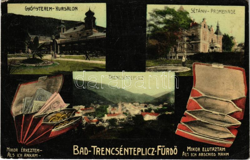 Leírás: Trencsénteplic-fürdő, Kúpele Trencianske Teplice; Gyógyterem, sétány, 'Mikor érkeztem- Mikor elutaztam' humoros képeslap. Kiadja Wertheim Zsigmod / kursalon, promenade, 'Alsich ankam - Als ich Abschied nahm' / spa, bath, promenade, humorous (EK)