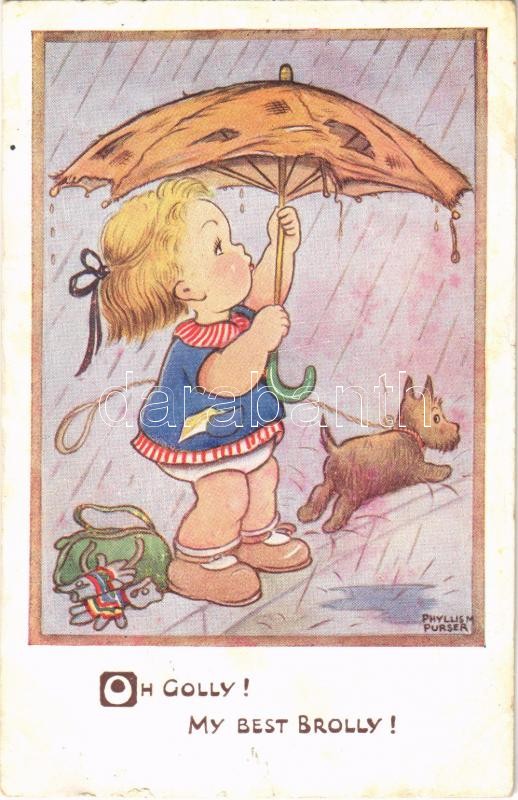 Leírás: 1948 "Oh Golly! My best brolly!" Children art postcard. Published by J. Salmon Ltd. s: Phyllis M. Purser (EB)
