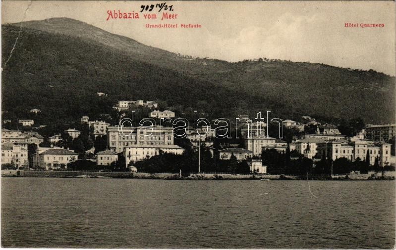 1909 Abbazia, Opatija; Vom Meer, Grand Hotel Stefanie and Quarnero (EB... https://www.darabanth.com/hu/498-Gyorsarveres/498.0/Kepeslapok/Horvatorszag~3000009/1909-Abbazia-Opatija-Vom-Meer-Grand-Hotel-Stefanie-and-Quarnero-EB~II3274771