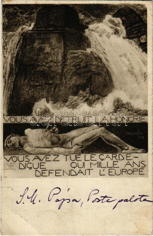 1920 Magyarország földarabolása ciklus III. képe: "Megöltétek a magyar gátőrt, aki ezer évig védte Európát" Kiadja Magyarország Területi Épségének Védelmi Ligája / Dismemberment of Hungary. "You have killed Hungary and destroyed the dikes which defended Europe for a thousand years" Hungarian irredenta propaganda, Trianon s: Unghváry Sándor (EB)