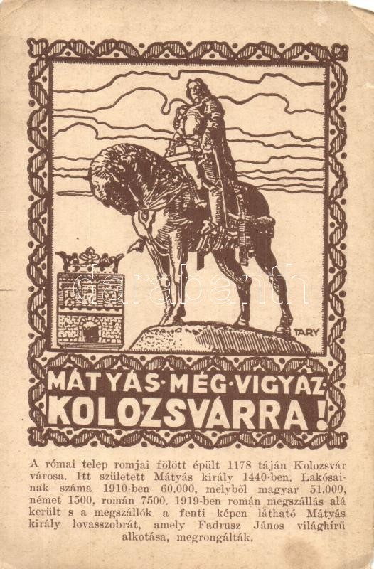 Mátyás még vigyáz Kolozsvárra! / Hungarian irredenta propaganda, Matth... https://www.darabanth.com/hu/498-Gyorsarveres/498.0/Kepeslapok/Irredenta~3000049/Matyas-meg-vigyaz-Kolozsvarra-Hungarian-irredenta-propaganda-Matthias-Corvinus-statue-Math~II1905301