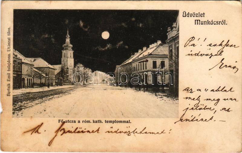 1904 Munkács, Mukacheve, Mukacevo; Fő utca a római katolikus templommal télen este holdfényben, Wittelmann Samu üzlete. Bertsik Emil kiadása / main street, church in winter at night in moonlight, shops (b)