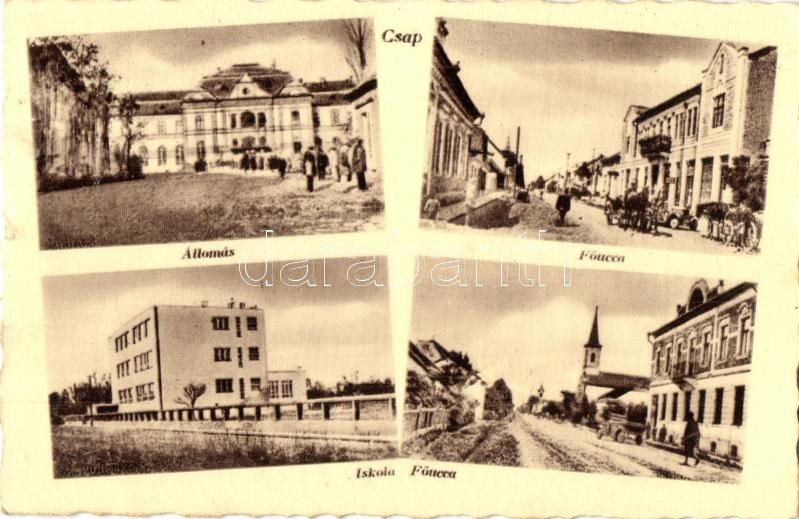 Leírás: Csap, Chop; Vasútállomás, Fő utca, automobil, Iskola / railway station, main street, automobile, school (apró szakadás / tiny tear)