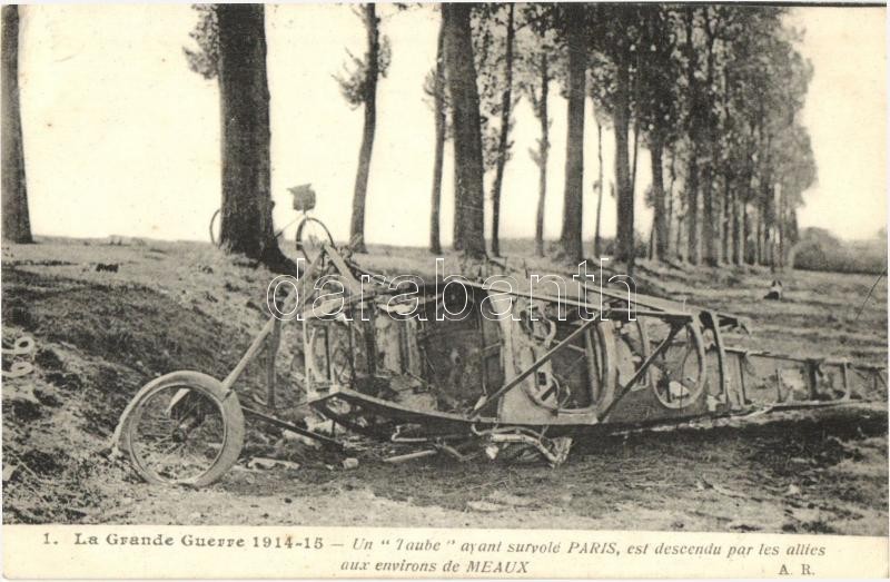 Leírás: Un "Taube avabt survolé Paris, est descendu par les allies aux environs de Meaux, La Grande Guerre 1914-1915 / WWI destroyed aeroplane