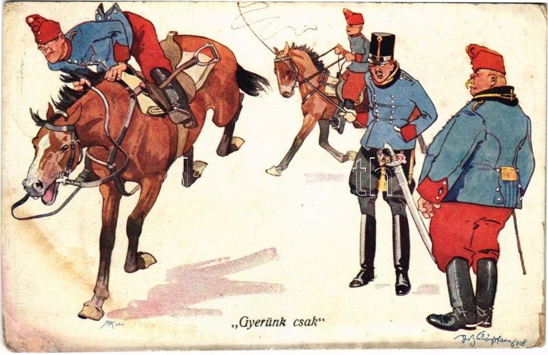 1908 Gyerünk csak / Austro-Hungarian K.u.K. military art postcard, hum... https://www.darabanth.com/hu/498-Gyorsarveres/498.0/Kepeslapok/Katonai~3000058/1908-Gyerunk-csak-Austro-Hungarian-KuK-military-art-postcard-humour-hussar-cavalryman-BK~II2176238