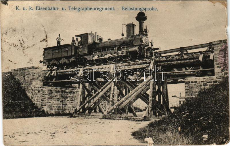 1912 Cs. és kir. vasúti ezred hídépítői terheléses teszt közben, gőzmozdony, vonat / K.u.K. Eisenbahn- u. Telegraphenregiment, Belastungsprobe / Austro-Hungarian Railroad Regiment, military railway bridge load test with locomotive, train (b)