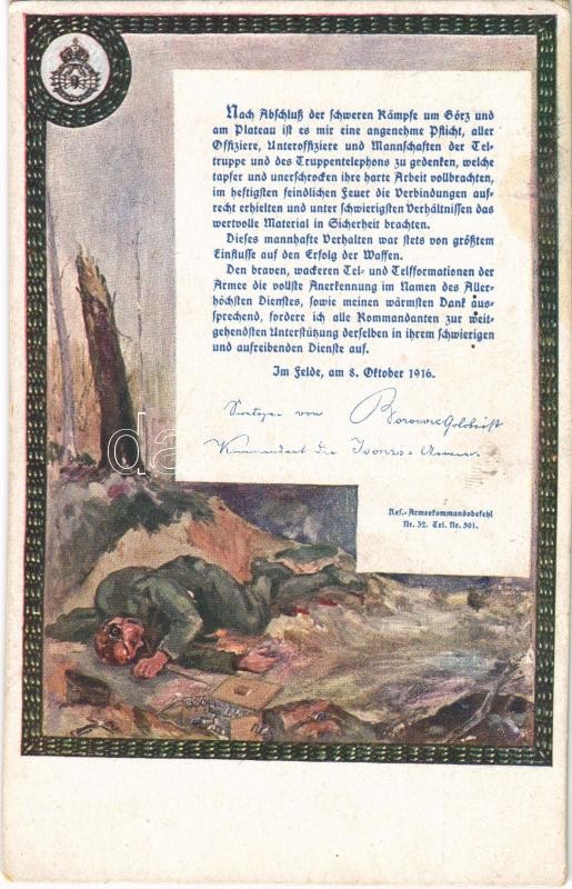 Leírás: Nach Abschluß der schweren Kämpfe um Görz... / WWI German military art postcard, troop's telephone station (EK)