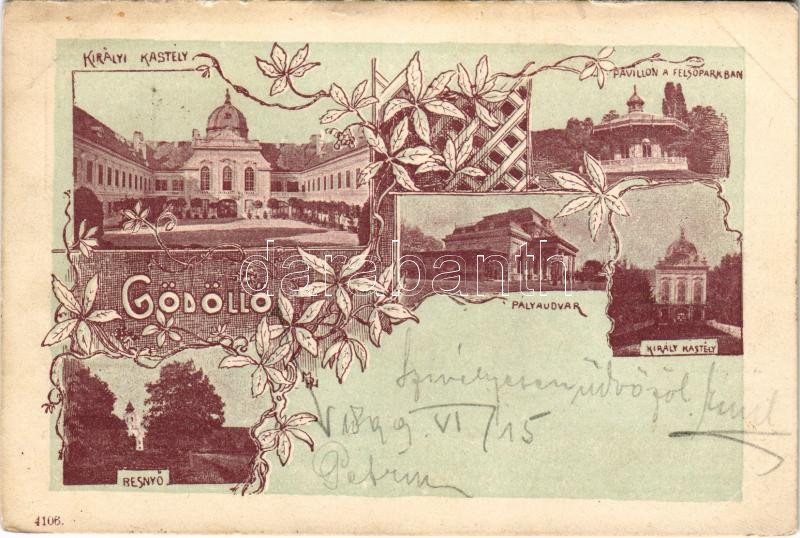 Leírás: 1899 (Vorläufer!) Gödöllő, királyi kastély, pavillon a felső parkban, Máriabesnyő, pályaudvar, vasútállomás. Art Nouveau, floral (fl)