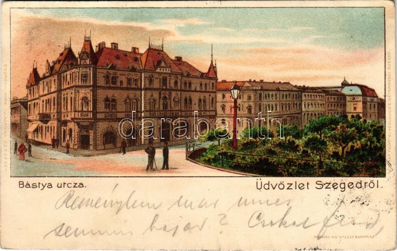Leírás: 1899 (Vorläufer) Szeged, Bástya utca. Endrényi Imre kiadása. Fénykép felvétel Keglovich E. műterméből. Kosmos Műintézet litho (EB)