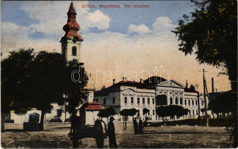 Gyula, Megyeháza, református templom. Dobay János kiadása https://www.darabanth.com/hu/498-Gyorsarveres/498.0/Kepeslapok/Magyarorszag~3000005/Gyula-Megyehaza-reformatus-templom-Dobay-Janos-kiadasa~II3032214