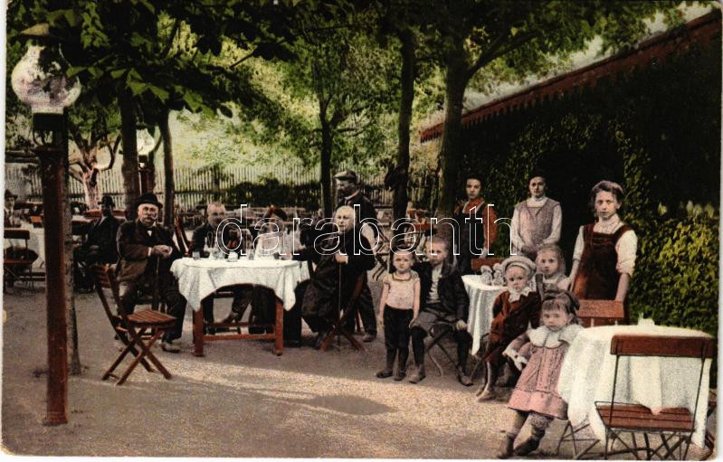 Leírás: Pécs, Rácváros, Pompár Izidor (akit városszerte Dóriként ismertek) vendéglője a Fehér Hollóhoz, étterem kertje (EK)