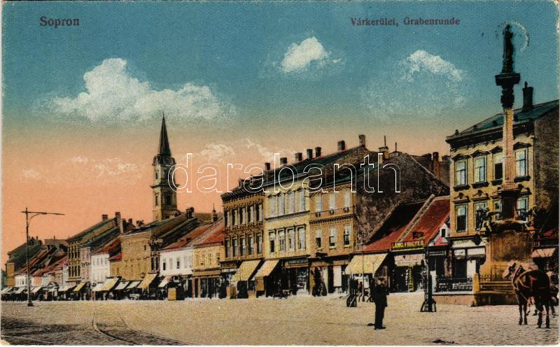 Leírás: Sopron, Várkerület, villamos, piac, Lang Frigyes üzlete. Vasúti levelezőlapárusítás 24. sz. - 1917. (EK)