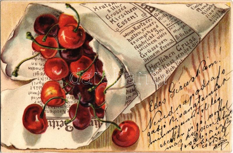 1902 Cherries in newspaper. Serie Düten 1257. Emb. litho https://www.darabanth.com/hu/498-Gyorsarveres/498.0/Kepeslapok/Muveszlapok~3000075/1902-Cherries-in-newspaper-Serie-Duten-1257-Emb-litho~II2160581