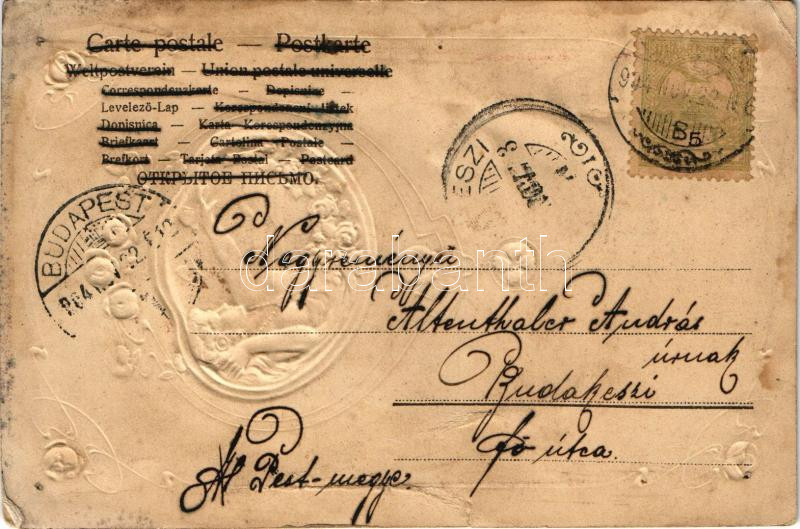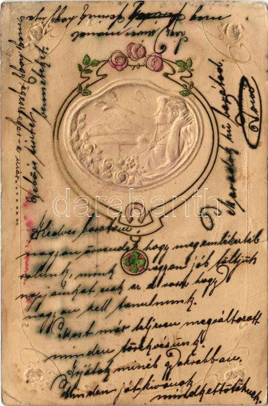 1904 Art Nouveau lady, Floral, Emb. litho (b) https://www.darabanth.com/hu/498-Gyorsarveres/498.0/Kepeslapok/Muveszlapok~3000075/1904-Art-Nouveau-lady-Floral-Emb-litho-b~II2962013
