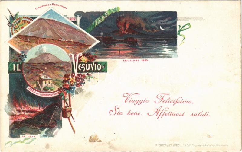 Napoli, Naples; Il Vesuvio, Eruzione 1895, Funicolare e Restaurant, Veduta dall' Osservatorio, La lava / Mount Vesuvius, eruption in 1895, observatory, lava, funicular, restaurant. Richter & Co. Art Nouveau, floral, litho (Rb)