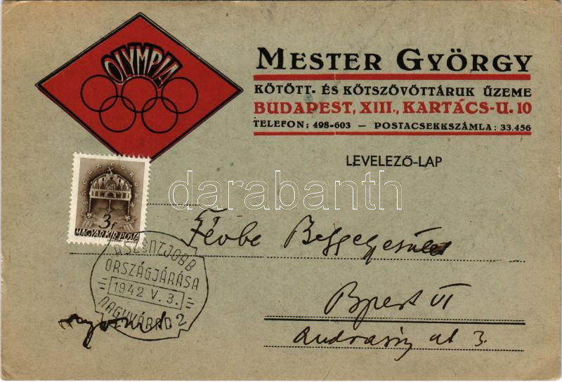 1942 Olympia - Mester György kötött- és kötszövött áruk üzeme reklám. ... https://www.darabanth.com/hu/498-Gyorsarveres/498.0/Kepeslapok/Reklam~3000086/1942-Olympia-Mester-Gyorgy-kotott-es-kotszovott-aruk-uzeme-reklam-Budapest-Kartacs-u~II3292691