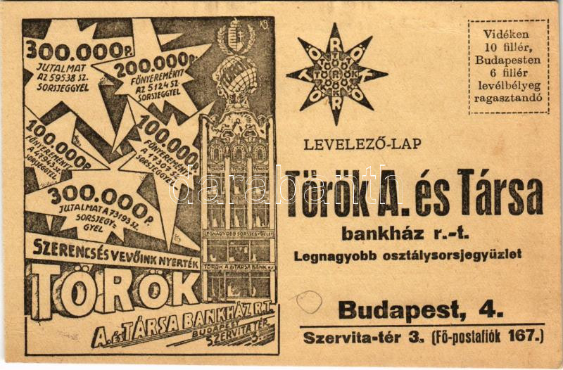 Török A. és Társa Bankház rt. legnagyobb osztálysorsjegyüzlet reklám. ... https://www.darabanth.com/hu/498-Gyorsarveres/498.0/Kepeslapok/Reklam~3000086/Torok-A-es-Tarsa-Bankhaz-rt-legnagyobb-osztalysorsjegyuzlet-reklam-Budapest-Szervita-te~II2992349