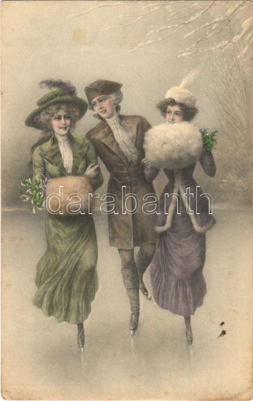 Leírás: 1910 Ice skating ladies, romantic couple, winter sport. M. Munk Vienne Nr. 561. (EK)